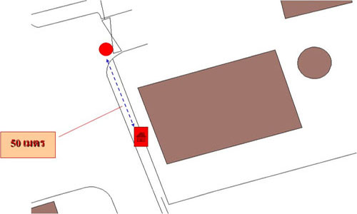 ประมาณ 50 เมตร โดยอาจจะวัดระยะด้วยเทปหรือการนับก้าวระหว่างจุดสนใจกับจุดที่ปรากฏในแผนที่