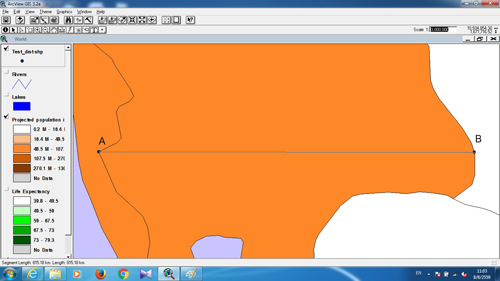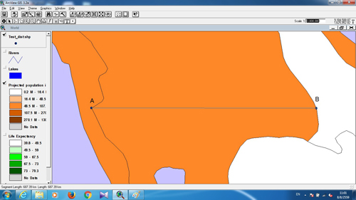 3. เมื่อกำหนด Projection : Equal Area Cylindrical ระยะ A-B วัดได้ประมาณ 815 กิโลเมตร