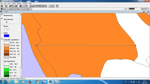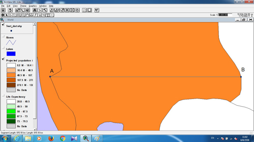 2. เมื่อกำหนด Projection : Mercator ระยะ A-B วัดได้ประมาณ 815 กิโลเมตร