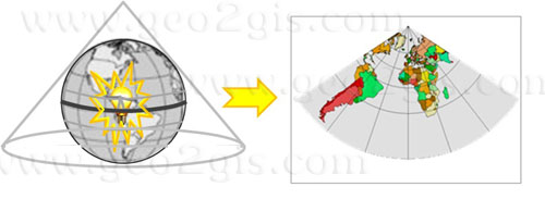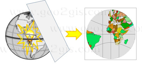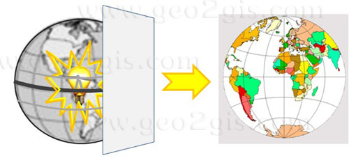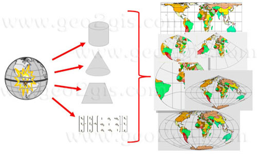 นักภูมิศาสตร์ผู้ผลิตแผนที่พยายามหาวิธีถ่ายทอดข้อมูลปรากฏการณ์บนผิวโลกที่เป็นทรงกลม (หรือรูปทรงเกือบเป็นทรงกลม ที่เรียกว่า geoid หรือ ellipsoid ซึ่งนำมาใช้คำนวณทางคณิตศาสตร์ ) ให้มาสู่แผ่นราบโดยใช้การคำนวณทางคณิตศาสตร์จากการจิตนาการว่า......