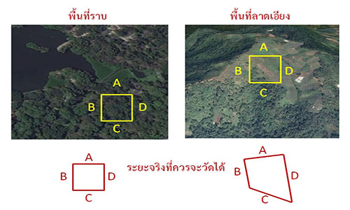 หากมีการวัดพื้นที่ที่บนภาพถ่ายจากดาวเทียมที่ถ่ายภูมิประเทศที่ต่างกัน คือ ภูมิประเทศที่เป็นที่ราบกับภูมิประเทศที่เป็นพื้นที่ที่มีความลาดเอียง โดยมีการวัดบนภาพถ่ายด้วยระยะทางหรือขนาดพื้นที่ที่เท่ากัน ข้อเท็จจริงจะพบว่า ระยะทางและขนาดพื้นที่ที่ถูกต้องบนภูมิประเทศที่มีความลาดเอียงจะมากกว่าภูมิประเทศที่เป็นที่ราบ