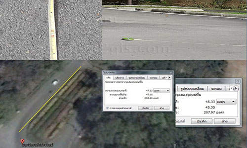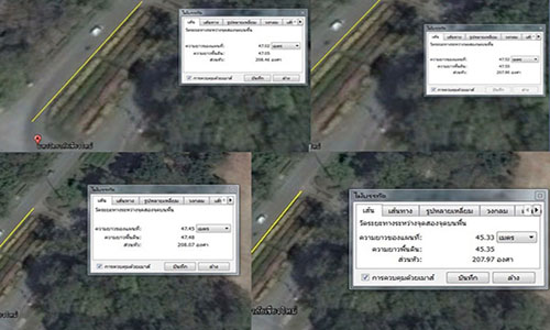 การวัดระยะที่ภาพถ่ายจากดาวเทียมของ Google Earth ซ้ำๆ กันโดยพยายามขยายภาพให้ชัดเจนหลายๆครั้ง หลายๆ มุม ซึ่งระยะที่วัดได้จะแตกต่างกันไป เช่น 47.52 เมตร 47.45 เมตร 47.02 เมตร 46.74 เมตร และ 45.33 เมตร เป็นต้น