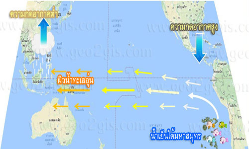 - น้ำอุ่นที่ไหลมาจากแปซิฟิกตะวันออกได้ไหลมารวมกันทางแปซิฟิกตะวันตก ด้วยปริมาณและอุณหภูมิที่สูงขึ้น น้ำทะเลจะลอยและกลั่นตัวเป็นเมฆและตกมาเป็นฝนทำให้บริเวณตะวันออกและตะวันออกเฉียงใต้ของเอเชีย รวมทั้งตอนเหนือของออสเตรเลียมีความชุ่มชื้นฝนตกชุกสามารถทำการเกษตรได้ดี