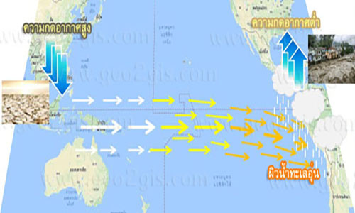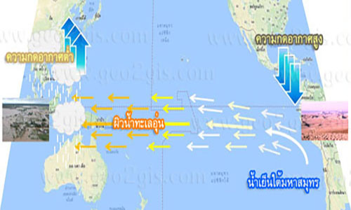 ในบางปีที่ความกดอากาศที่ระดับน้ำทะเลบริเวณตะวันออกของมหาสมุทรแปซิฟิกเขตศูนย์สูตร(ชายฝั่งตะวันตกของทวีปอเมริกาใต้แถบเอกวาดอร์ เปรูและชิลี) ต่ำกว่าปกติ ความกดอากาศอีกฝั่งหนึ่งของมหาสมุทร (บริเวณตะวันออกและตะวันออกเฉียงใต้ของเอเชีย รวมทั้งตอนเหนือของออสเตรเลีย) สูงกว่าปกติ