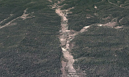 At the end of the watercourse, as it flows into the sea, sedimentation occurs where carried sediments settle and accumulate. This triangular-shaped sediment deposit at the river mouth is known as a delta.