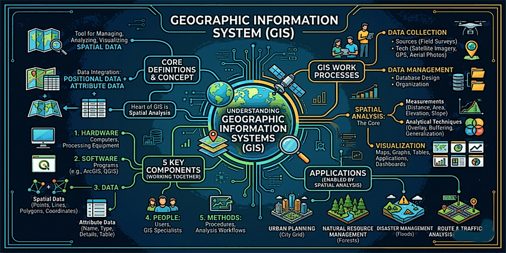 GIS ถูกนำไปใช้ในหลากหลายสาขา เช่น การวางผังเมือง การจัดการทรัพยากรธรรมชาติ และการบริหารจัดการภัยพิบัติ GIS มีองค์ประกอบสำคัญ 2 ประเภท ได้แก่ ข้อมูลเชิงพื้นที่ (Spatial Data): ข้อมูลที่ระบุพิกัดตำแหน่ง เช่น จุด เส้น และพื้นที่ ข้อมูลเชิงคุณลักษณะ (Attribute Data): ข้อมูลรายละเอียดของสิ่งนั้น เช่น ชื่อ ประเภท หรือคุณสมบัติ