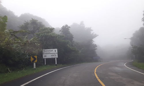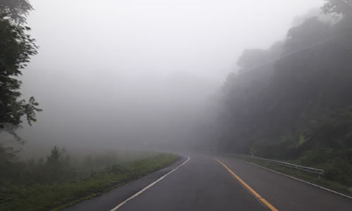 Starting from the winding road to Doi Inthanon's steep summit. Turning left towards Mae Jam, the car follows a steep route that winds sharply through a dark, dense path surrounded by thickets and shrouded in white mist.
