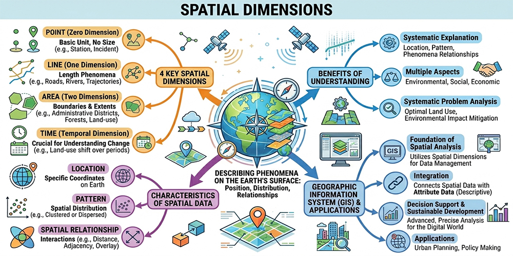 Spatial dimensions are a fundamental concept in geography used to explain the location, distribution, and relationships of phenomena on the Earth’s surface. These dimensions primarily include point, line, area, and time. Understanding spatial dimensions enables a systematic interpretation of the location, patterns, and relationships of various phenomena across environmental, social, and economic contexts.